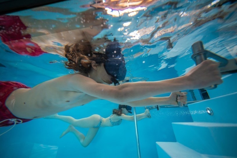 « Cela fonctionne avec un caque VR et un tuba », détaille Mathis Gullon, chef de projet. « [On se tient à des poignées sous l’eau] et tous les effets se déclenchent : le courant artificiel, les jets, les bulles, pour que ton expérience soit parfaite », précise-t-il.
