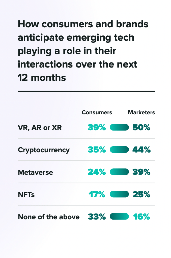 The metaverse may have the answers. Consumers are steadily grasping the importance of this emerging technology with 39% saying virtual, artificial or extended reality technologies will play a role in their brand interactions over the next year and 67% of marketers expecting to spend at least a quarter of their budget on these tactics.