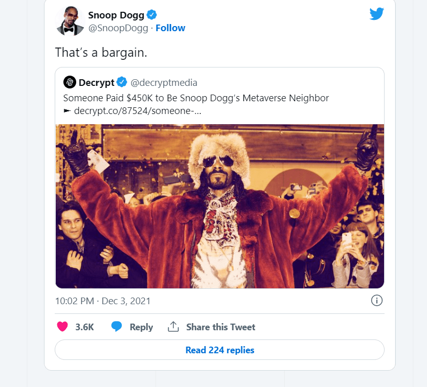 Someone paid nearly half a million dollars to be Snoop Dogg’s neighbor in The Sandbox metaverse.